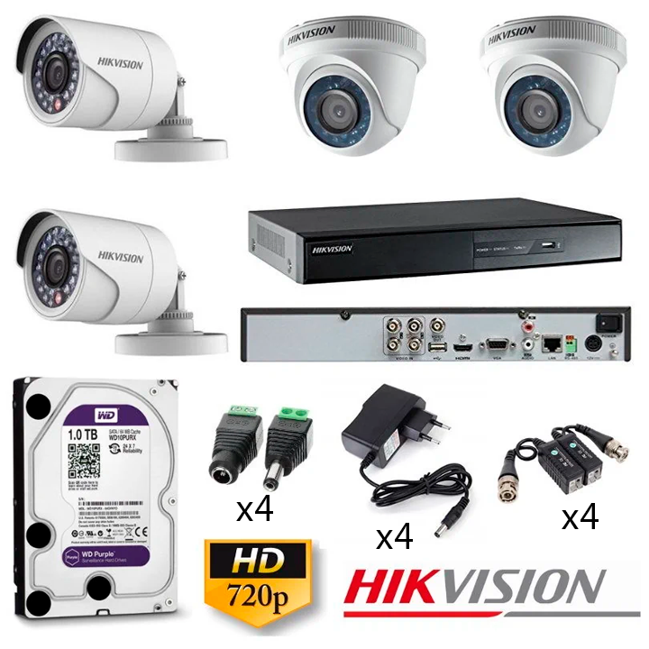 HIKVISION KIT 4 Cámaras 720P HD DVR 4CH DS-7204HGHI-F1 1TB HDD Cable HDMI Mouse Accesorios