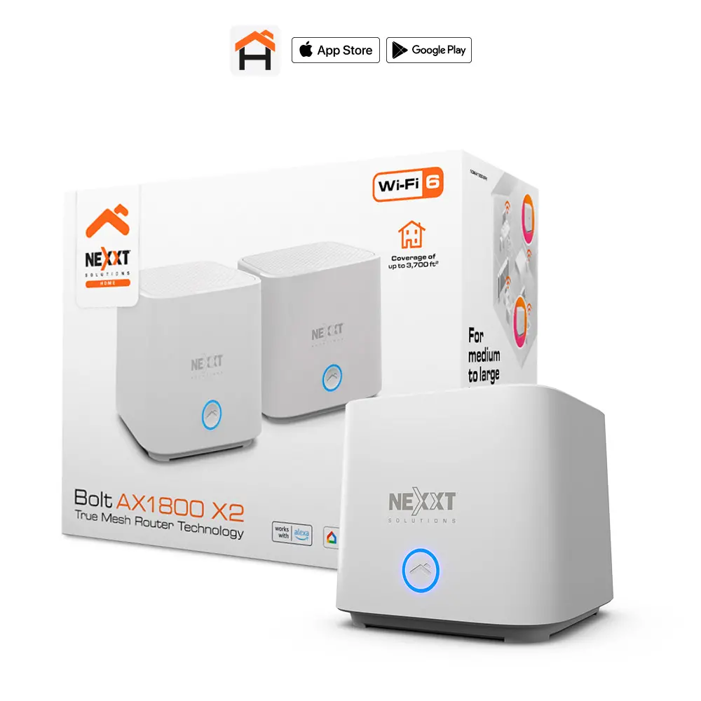 El NCM-X1800 2PK es un sistema de Wi-Fi en malla de Nexxt Solutions, diseñado para brindar una cobertura Wi-Fi sin interrupciones en toda la casa. Ofrece una velocidad combinada de hasta 1800 Mbps y utiliza la última tecnología Wi-Fi 6 (AX) para lograr conexiones más rápidas y confiables.